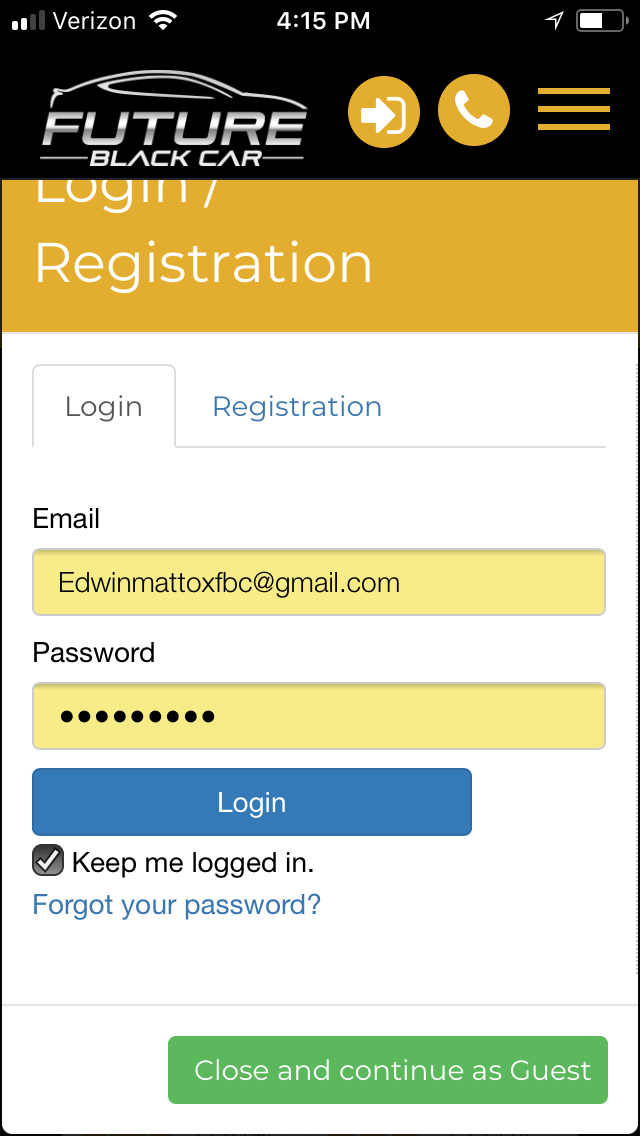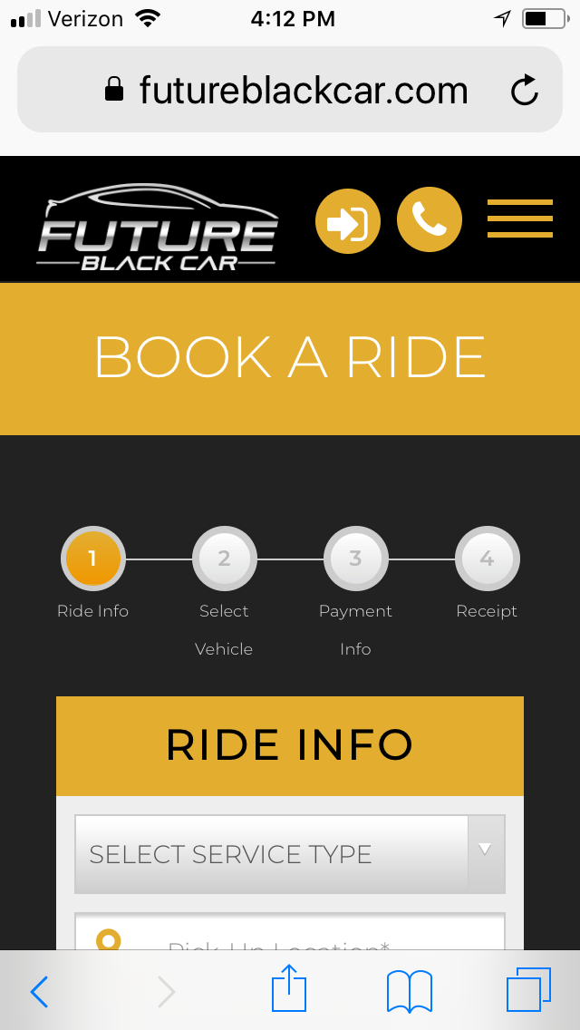 1. Go to: https://futureblackcar.com /book-a-ride/ and click on the "Go To Button" at the bottom of the screen (Square icon with an arrow pointing up)